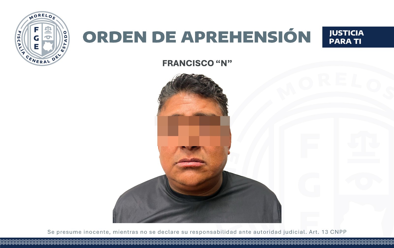 Las personas son citadas en este comunicado de acuerdo a lo marcado por el artículo 13 del Código Nacional de Procedimientos Penales, que dice: “Toda persona se presume inocente y será tratada como tal en todas las etapas del procedimiento, mientras no se declare su responsabilidad mediante sentencia emitida por el Órgano jurisdiccional”.