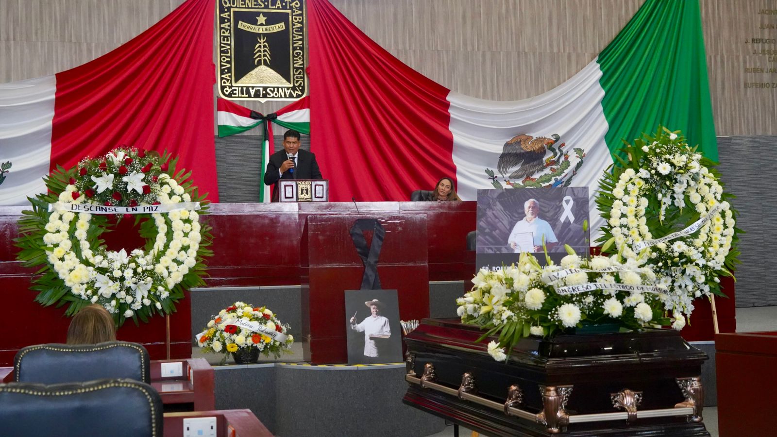 Al expresar las sentidas condolencias a su querida familia, a su esposa Doña Amparo, a toda su descendencia, y a nuestra apreciada compañera diputada Tania Valentina Rodríguez Ruíz a nombre de la LV Legislatura por la triste partida del maestro Roberto Rodríguez Navarro, el presidente de la Mesa Directiva Francisco Erick Sánchez Zavala, destacó que “su legado es parte de la cultura del Morelos del Siglo XX, del Siglo XXI y de siempre”.